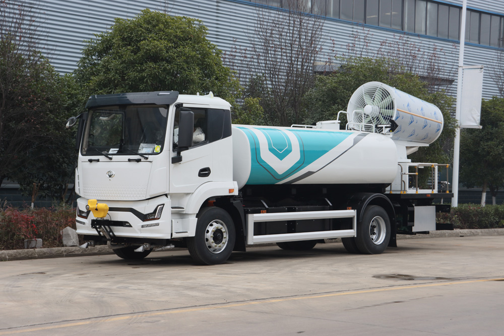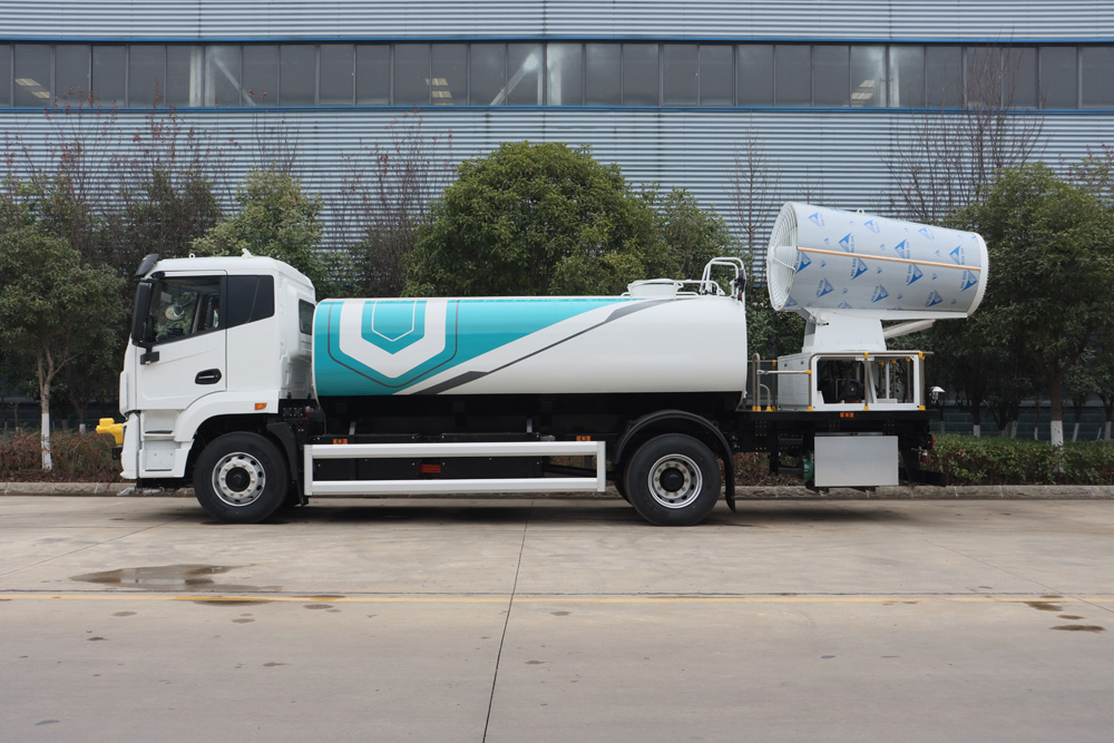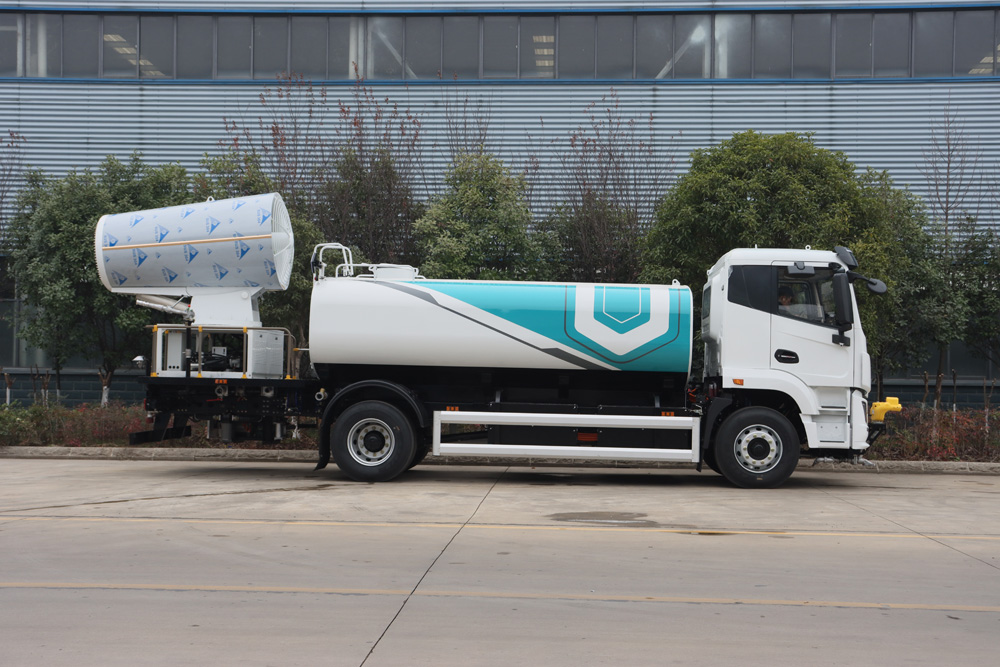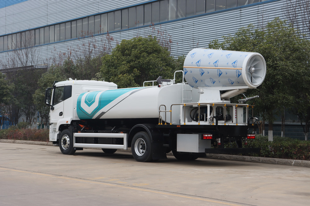 整車具備前噴、對沖、后灑、側噴、綠化水炮、霧炮,外接手動噴槍等多種作業功能,均可單 獨或組合使用,罐體有效容積 9.65m³ , 同級別行業最大;