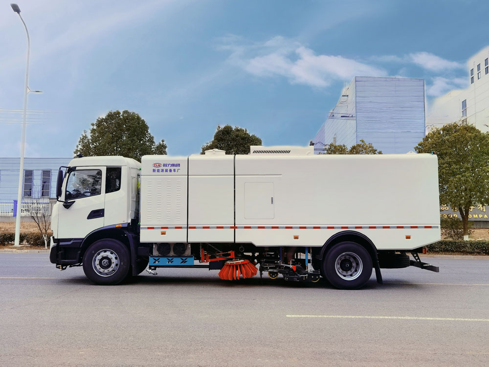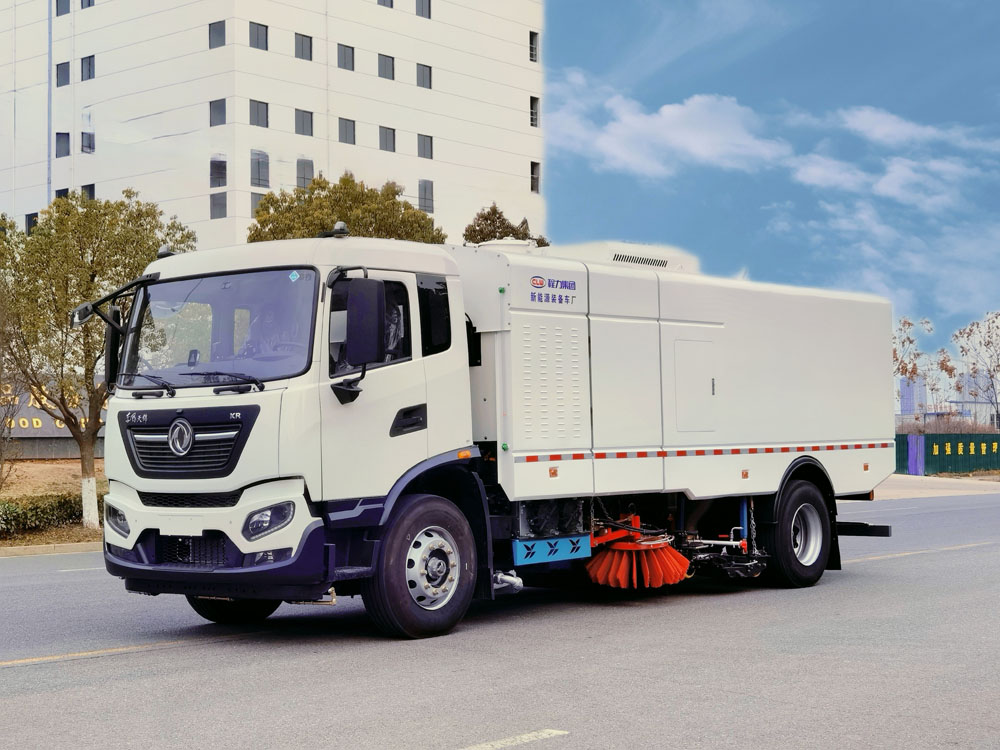 該車特點 東風天錦純電動洗掃車是我公司研制開發的集掃路車和高壓清洗車功能于一體 的高效環衛車。整車動力強勁,結構先進,掃、吸、洗相結合,作業效果好。一次作業,三重 收獲,道路清掃、路面高壓清洗、垃圾污水收集一次完成,此洗掃功能解決了不可視垃圾清理 的作業難題,從源頭上遏制道路揚塵,還原路面本色。