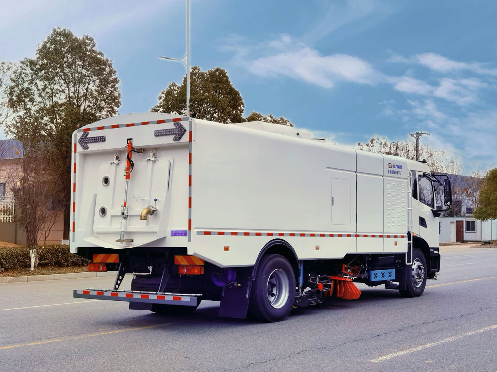該洗掃車的清掃系統采用“中置兩立掃+中置寬吸嘴+吸嘴高壓中噴桿+左、右高壓側噴