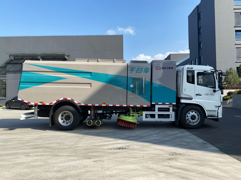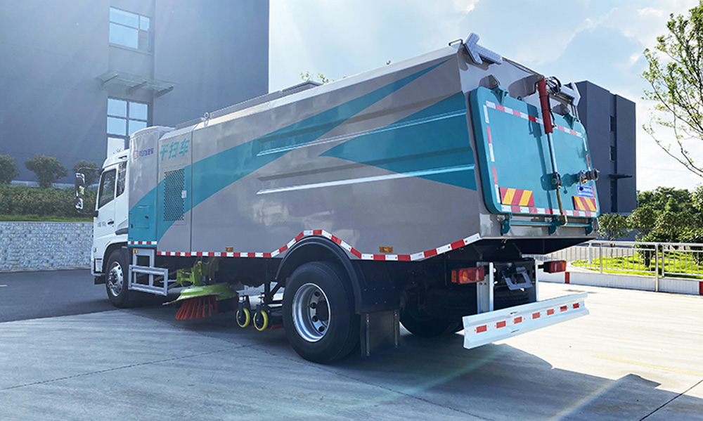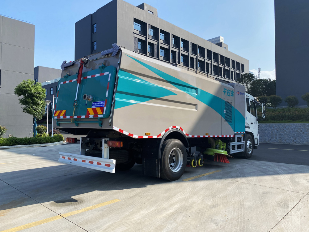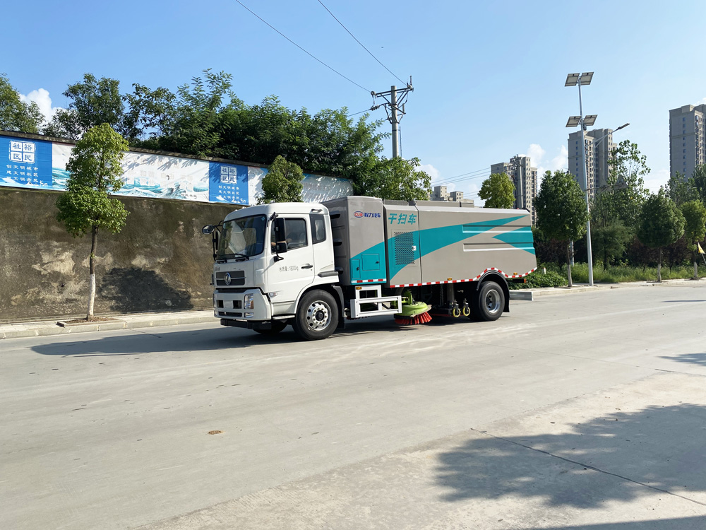 底盤發動機驅動洗掃車向前行走,掃至吸嘴前方的垃圾不斷進入到吸嘴中,并源源不斷地被吸到垃圾箱中,實現路面清掃。