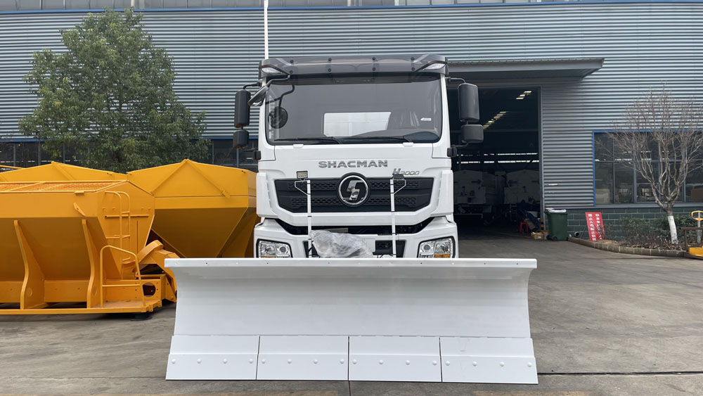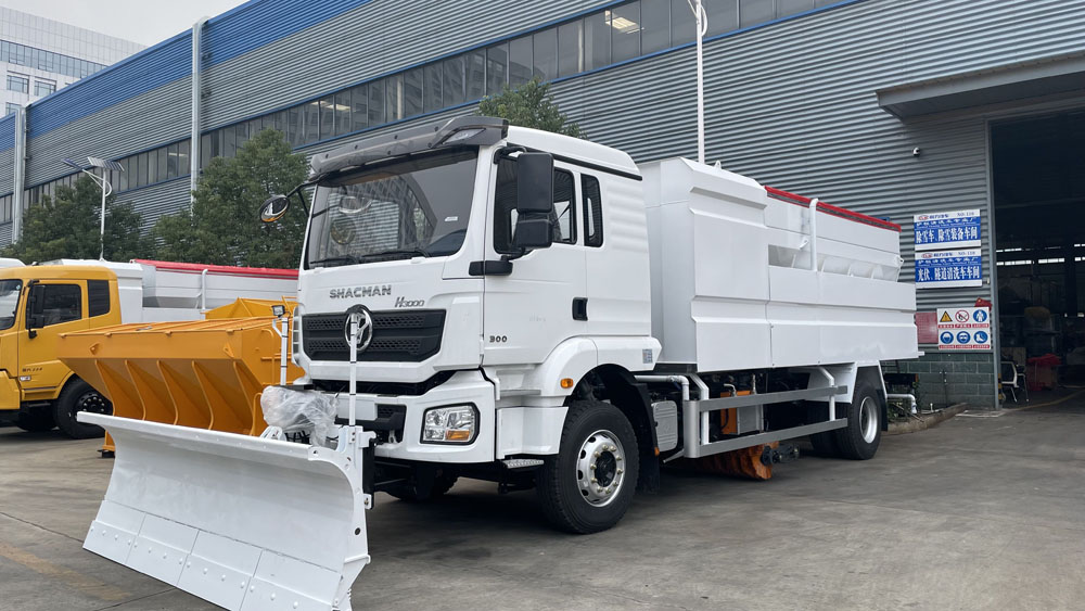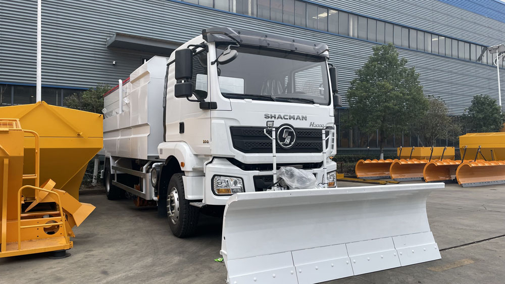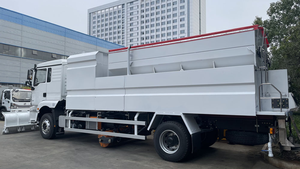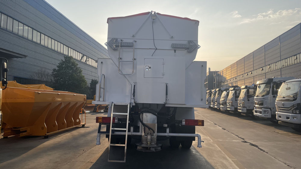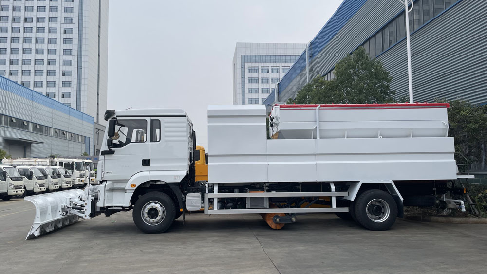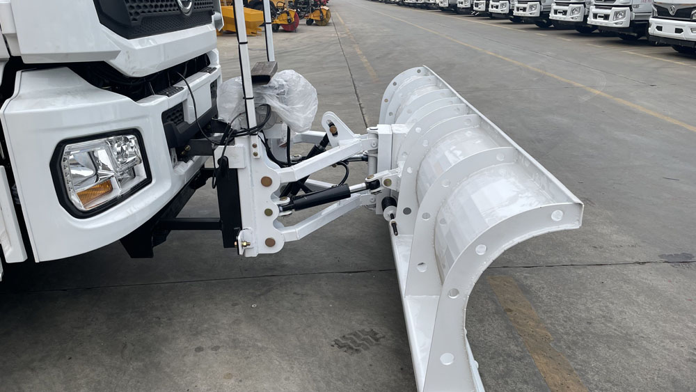 - 后置融雪撒布機(jī):車(chē)輛尾部配備融雪撒布機(jī),在冬季除雪過(guò)程中拋灑融雪劑,防止?jié)窕穆访娼Y(jié)冰影響交通,覆蓋過(guò)融雪劑的路面能很好地解決路面結(jié)冰問(wèn)題,使車(chē)輛安全通過(guò),不受天氣影響 。