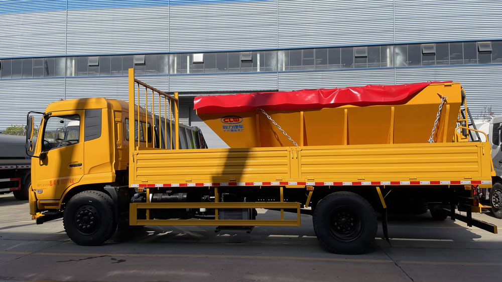一、底盤配置: 采用東風天錦DFH1180EX8車身,配置玉柴D6.7NS6B230發動機169/230馬力,國六排放標準,軸距4200,4500,4700,(mm),整備質量9噸,額定載質量8.805噸,五擋變速箱,帶動力轉向,帶原廠空調,該車用于冬季撒布融雪劑;專用裝置為撒布機, 2.前伸尺寸均為160mm; 3.側防護所用材料為Q235,連接方式為焊接,后部防護所用材料為Q235,離地高度為400mm; 該車上黃牌,城區道路請注意限行標識。