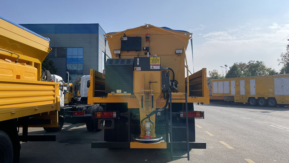 - 料箱設(shè)計(jì)合理:料箱容積較大,如有的型號(hào)可達(dá) 10m³,可減少加料次數(shù),提高作業(yè)效率。整機(jī)及料斗內(nèi)外采用碳鋼板結(jié)構(gòu),并進(jìn)行防腐處理,撒布盤為不銹鋼材質(zhì),具有良好的耐腐蝕性,適應(yīng)各種惡劣環(huán)境。料倉上蓋有網(wǎng)柵,可有效過濾大塊融雪劑,防止其堵塞輸送裝置;頂部還裝有遮蓋帆布,能防止雨、雪進(jìn)入料倉,保證融雪劑的質(zhì)量和撒布機(jī)的正常使用.