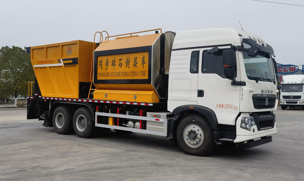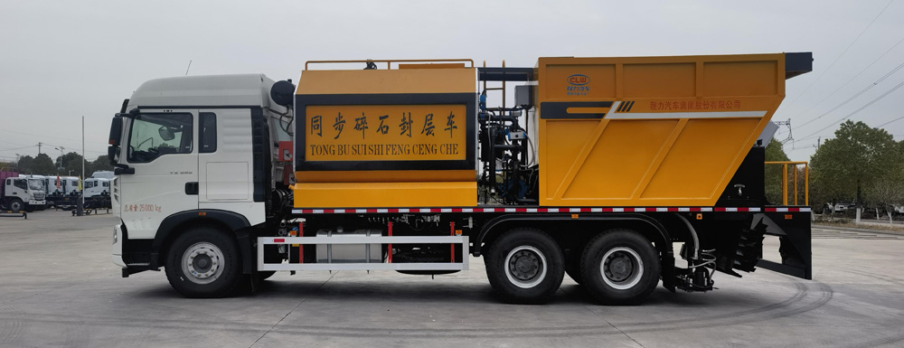 該車特點 同步碎石封層是指利用同步碎石封層車將瀝青結合料的噴灑和石料的灑布同時進行,使瀝青結合料與石料之間有最充分的接觸,以達到它們之間最大限度的粘結度。其更容易保證粘結劑和石料之間穩定的比例關系,提高作業生產率,減少了機械配置,降低了施工成本。瀝青路面經過同步碎石封層后,具有更好的防滑和防滲水性能,能有效治愈路面貧油、掉粒、輕微網裂、車轍、沉陷等危害。無論是高等級公路還是普通公路,都可以使用此項技術。